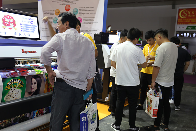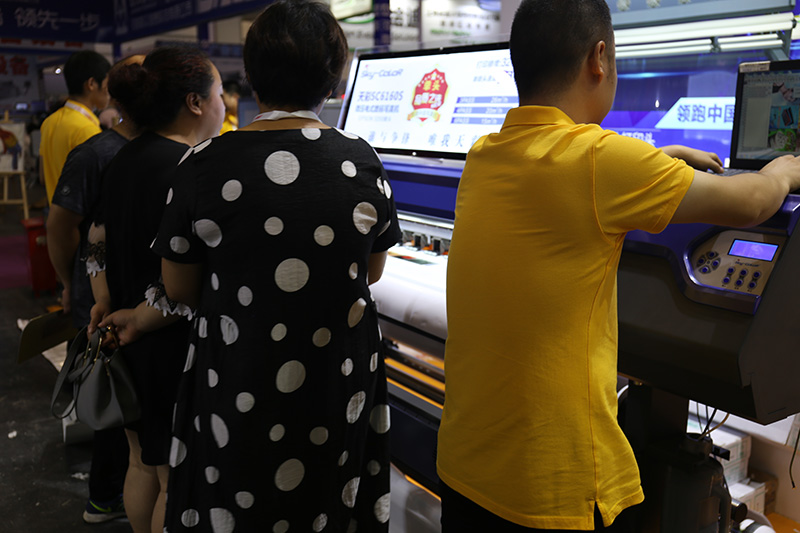 很多人圍在天彩寫真機(jī)旁邊,觀看天彩寫真機(jī)精美的打圖效果,并向身邊的技術(shù)人員咨詢?cè)O(shè)備的功能與優(yōu)勢(shì)。