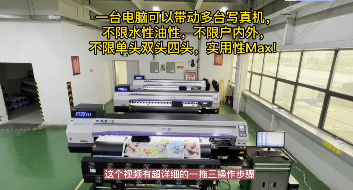 一拖三打印,顧名思義,就是一臺電腦帶動三臺寫真機打印。但在實際應(yīng)用中,一臺電腦可以帶動多臺寫真機打印,無論設(shè)備型號(單頭、雙頭……)、噴頭類型(水油),都可以實現(xiàn)一臺電腦控制,批量化生產(chǎn)。