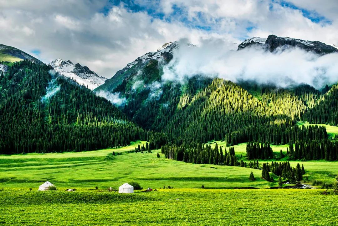 山巒芳草綠茵、蒼松凝翠,山頂角峰林立,冰山隱約可見