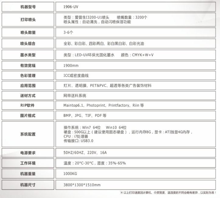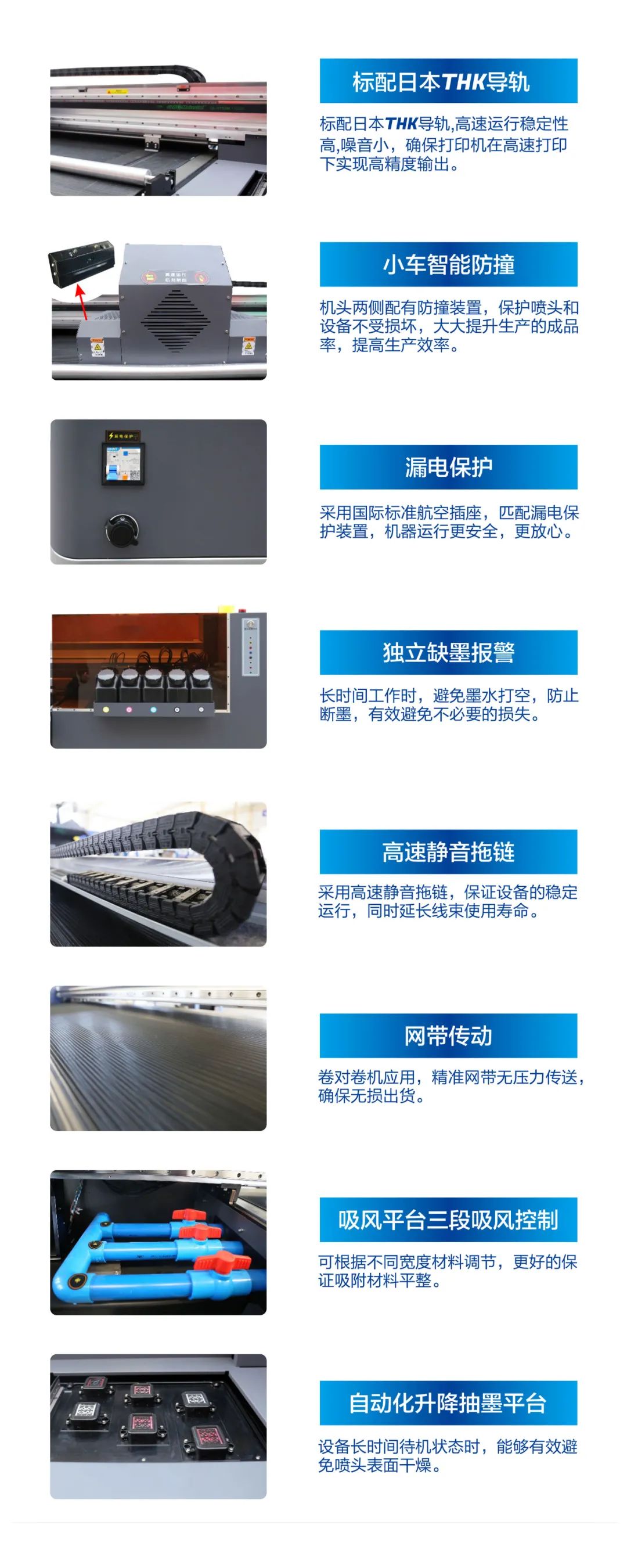 1.9米主流打印寬幅,可以滿足日常對(duì)多種打印材料的需求;設(shè)備采用THK靜音直線導(dǎo)軌,工業(yè)化機(jī)身,穩(wěn)定耐用,運(yùn)行平穩(wěn);畫(huà)質(zhì)檢測(cè)裝置LED光板,打印過(guò)程中檢查畫(huà)質(zhì)一目了然;UV燈固化速度快,即打即干,提高工作效率。