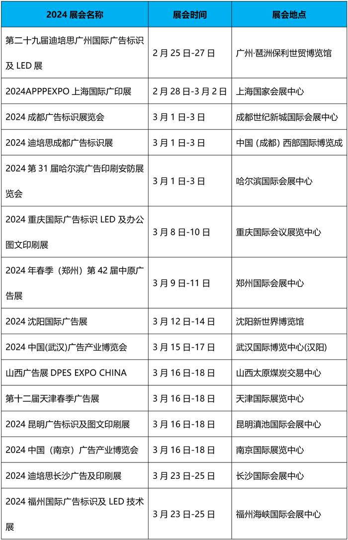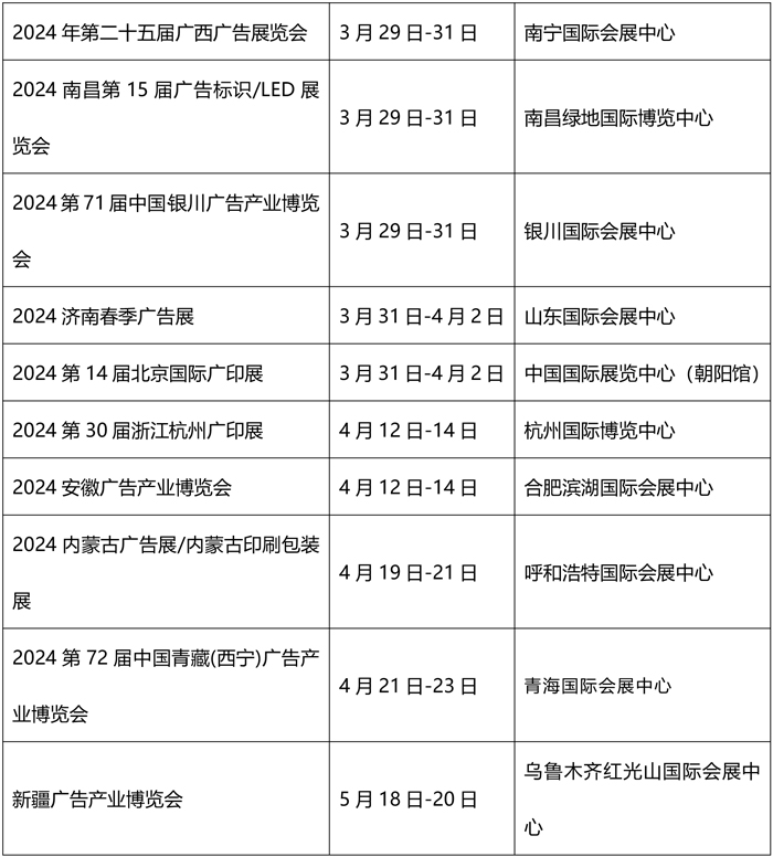 2024年的春季廣告展拉開了序幕,全國大大小小二三十個展會即將相繼登場,想要家門口看展的廣告人,千萬提前碼住這份2024春季廣告展時間安排表。