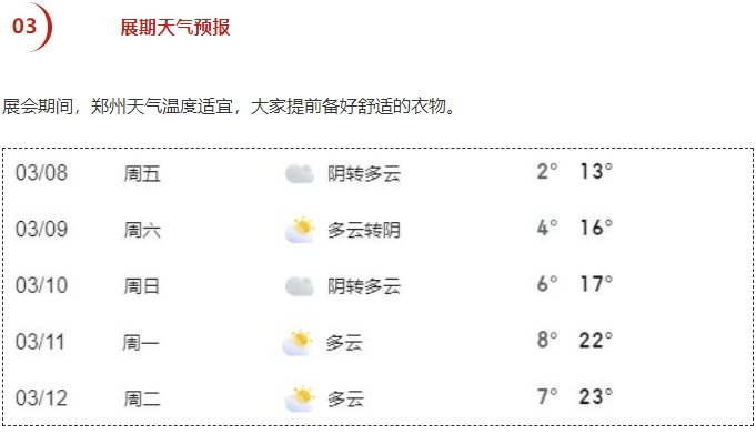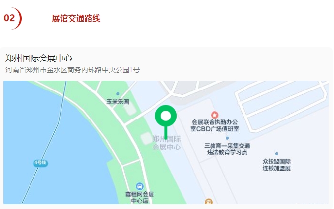 (2)地鐵5號線從鄭州東站上車,經(jīng)4站后至中央商務區(qū)站下車(A2口出),步行910米至展館;