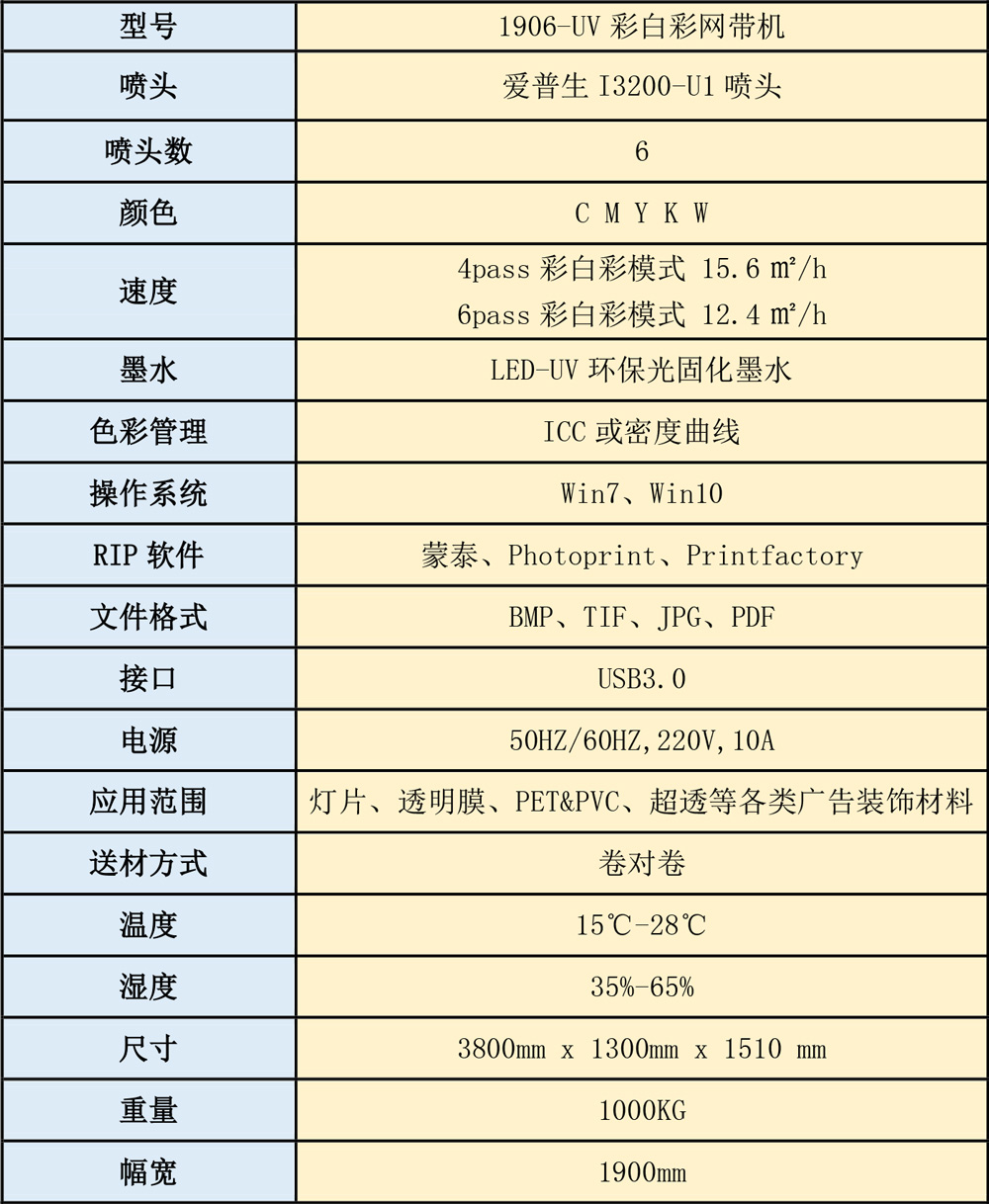 2021年天彩品牌新推出了多款打印設(shè)備,其中最為驚艷的莫過于1906-UV網(wǎng)帶機(jī),6個(gè)愛普生I3200-U1噴頭,打印模式多樣,打印時(shí)速15.6㎡/h,可以打印軟膜、卷材、超透貼、PVC等。