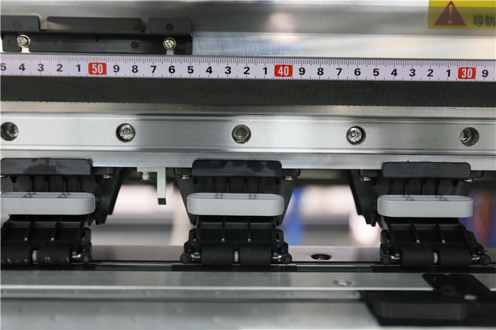 設(shè)備導(dǎo)軌上方安裝有標(biāo)尺,作用主要是為了方便打圖時(shí)定位原點(diǎn)。先在電腦里的打印軟件中預(yù)設(shè)一個(gè)原點(diǎn)位置的數(shù)值,然后進(jìn)行打印測試,通過標(biāo)尺衡量出實(shí)際打圖原點(diǎn)位置(即實(shí)際生產(chǎn)中的打圖位置)與預(yù)設(shè)打圖原點(diǎn)位置的差值,然后將差值與預(yù)設(shè)的位置數(shù)值進(jìn)行加減,最終得出準(zhǔn)確的打圖原點(diǎn)位置的數(shù)值。
