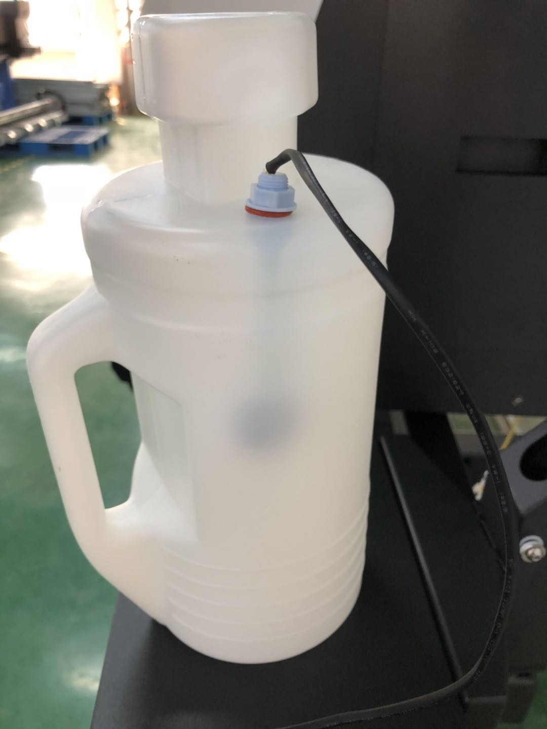 幻影H1高端機(jī)的廢墨桶中安裝有報(bào)警感應(yīng)裝置,一旦廢墨超過警戒線,報(bào)警系統(tǒng)會(huì)有聲音提示,操作人員可以及時(shí)的進(jìn)行廢墨清理。。寫真機(jī)廢墨桶安裝在豎腿旁邊的支架上,位置比較低,容易被大家忽略,廢墨報(bào)警裝置可以有效避免廢墨的溢出污染地面。