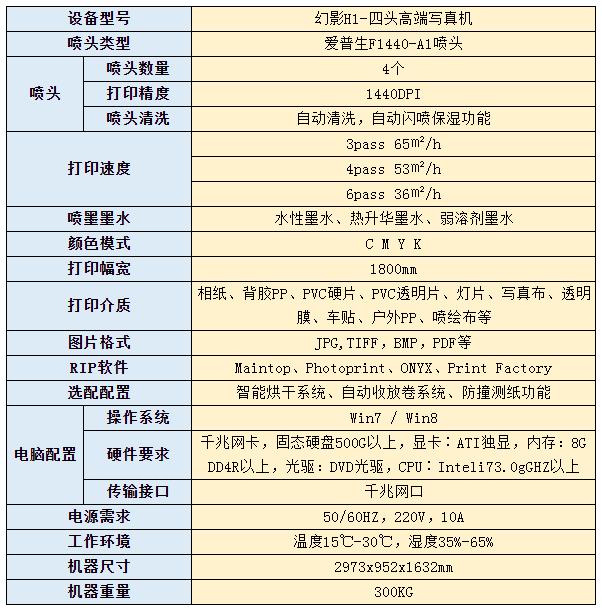 幻影H1高端現(xiàn)有兩種噴頭配置,一種是愛(ài)普生I3200-A1三頭配置,打印速度高達(dá)118㎡/h,另一種是愛(ài)普生F1440-A1四頭配置,戶內(nèi)外通用,4pass打印時(shí)速53㎡/h。