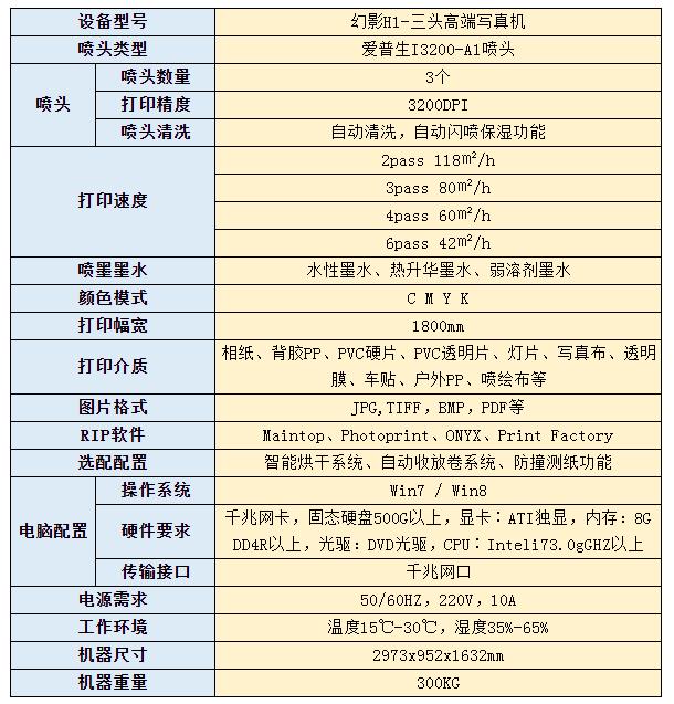 幻影H1高端機(jī)有兩種噴頭配置:一種是4個(gè)愛(ài)普生F1440-A1噴頭,一種是3個(gè)愛(ài)普生I3200-A1噴頭?,F(xiàn)在就一起來(lái)看看不同兩種不同配置的設(shè)備參數(shù)吧!